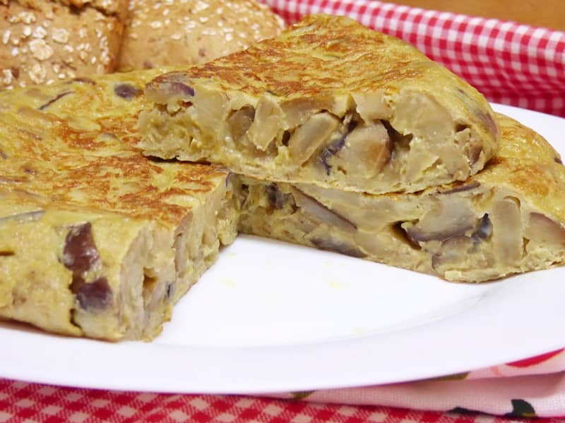 Esta tortilla de berenjena, enriquecida con cebolla, resulta muy jugosa y llena de sabor.