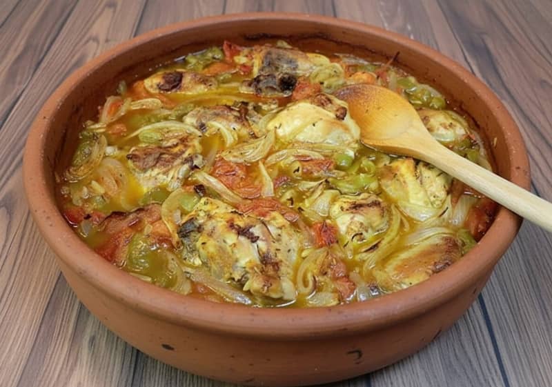 Es una receta deliciosa: un guiso de pollo para chuparse los dedos. Solo necesitas colocar todos los ingredientes en una cazuela y cocinarlo en el horno. Es una receta sencilla y rápida de preparar.